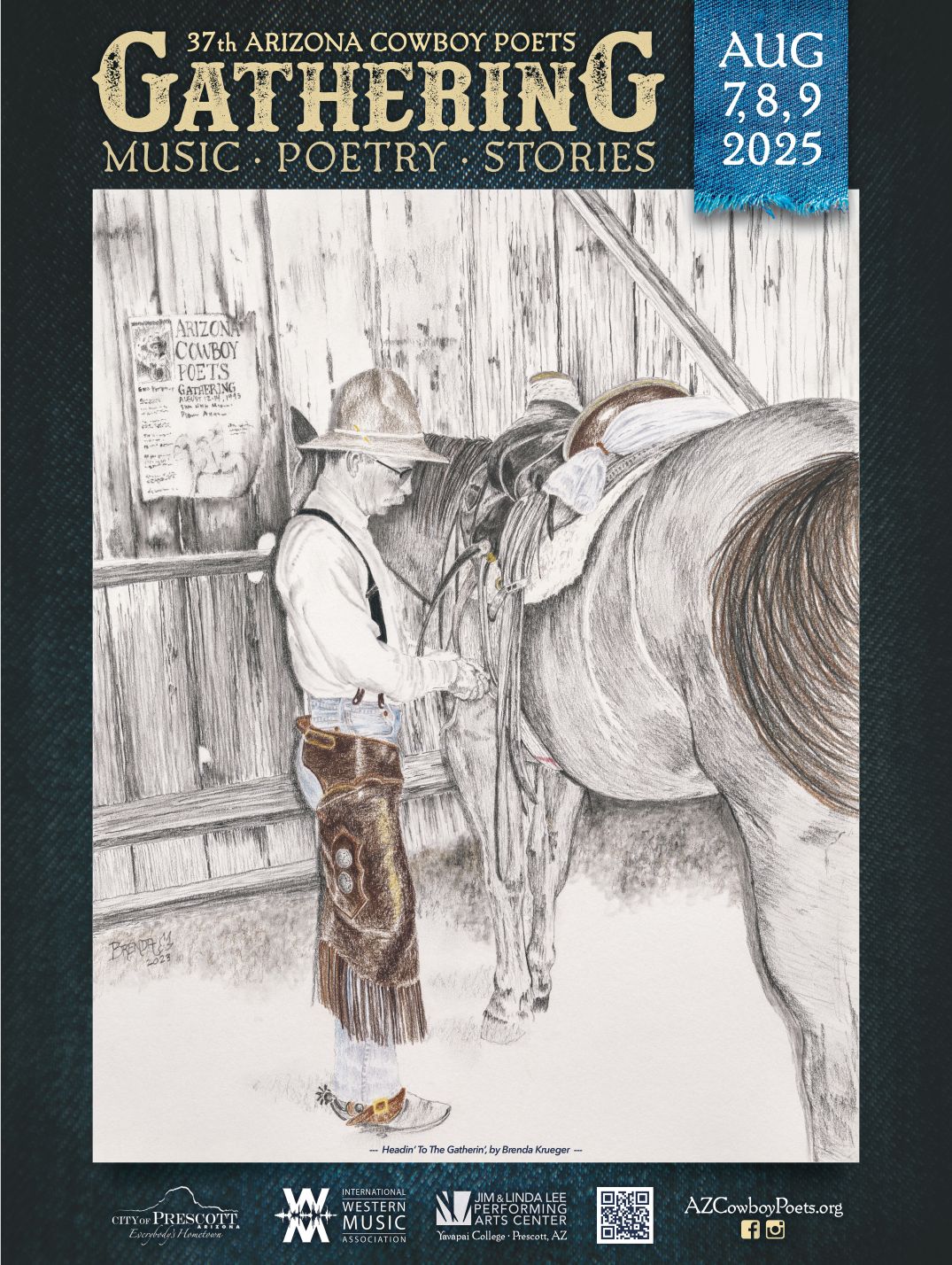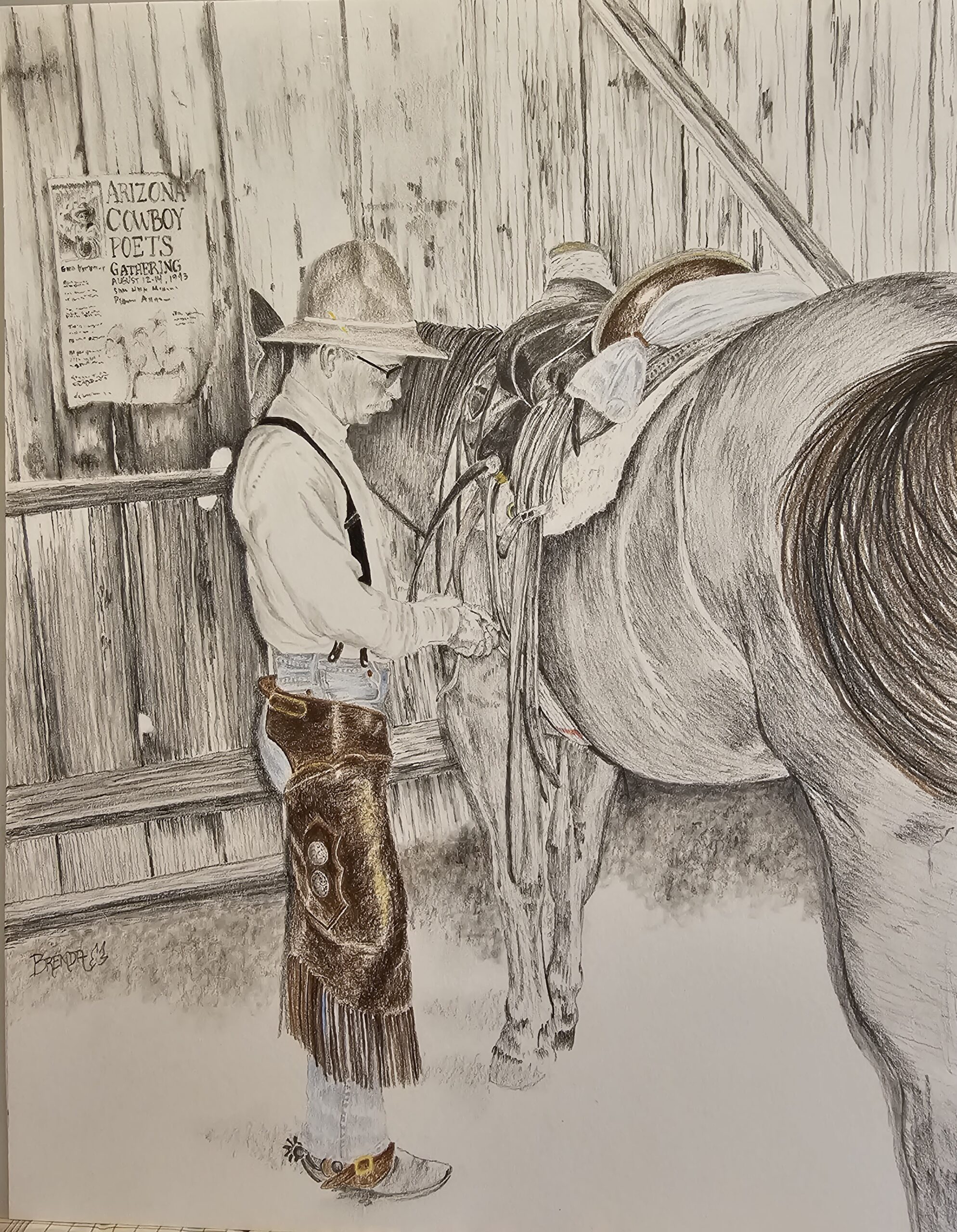 An original graphite and colored pencil drawing Titled ‘Headin’ To The Gatherin” by Prescott, Arizona artist, Brenda Krueger.
