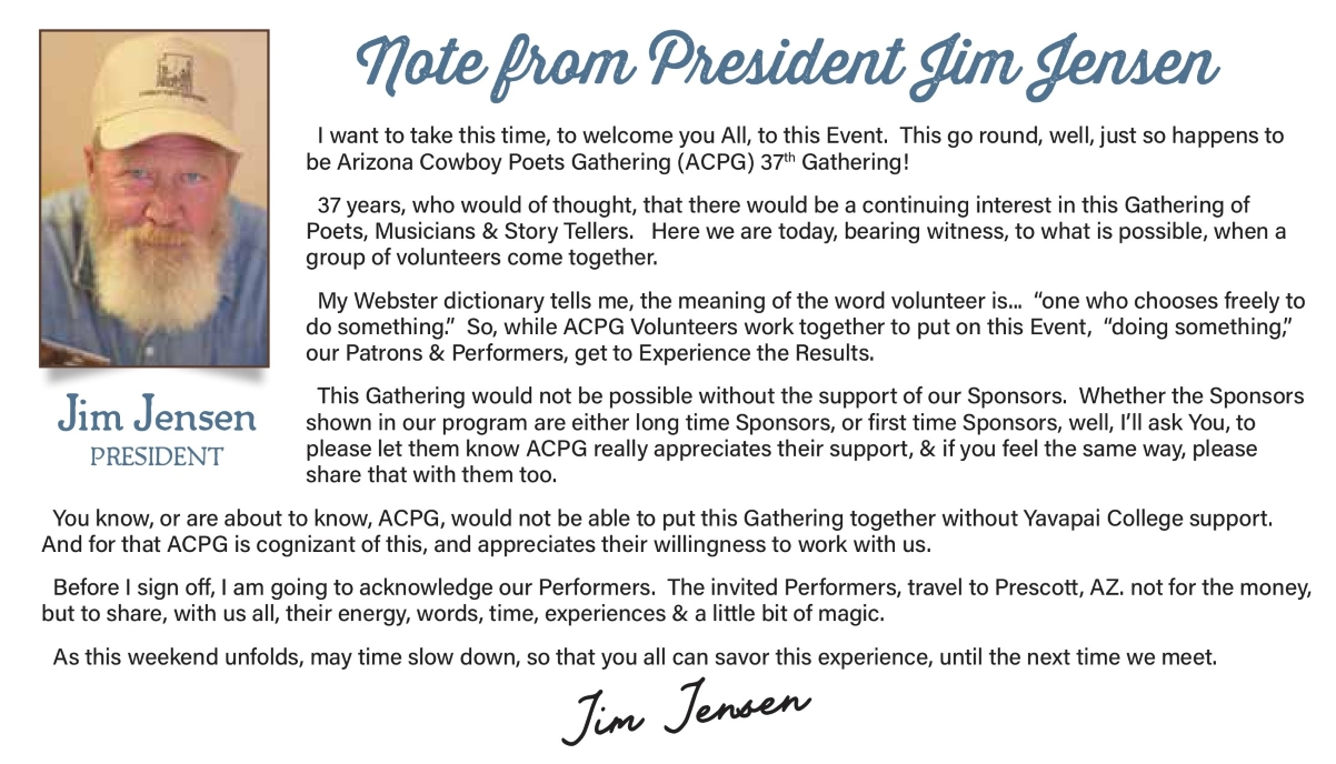 This event is now and has always been about gathering a group of poets and musicians who are doing their part to preserve the culture and heritage of the American West and providing them an opportunity to share their talent. The Arizona Cowboy Poets Gathering has maintained a standard that has been abandoned by most other gatherings: that of inviting men and women who are now or have been in the past a part of the working cowboy’s environment and workplace. It is respected by the cowboy poets as one of the best gatherings in the country because we’ve done so much to maintain the true “working cowboy” culture and heritage.